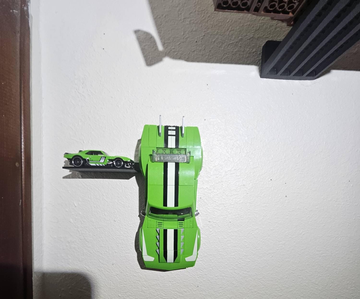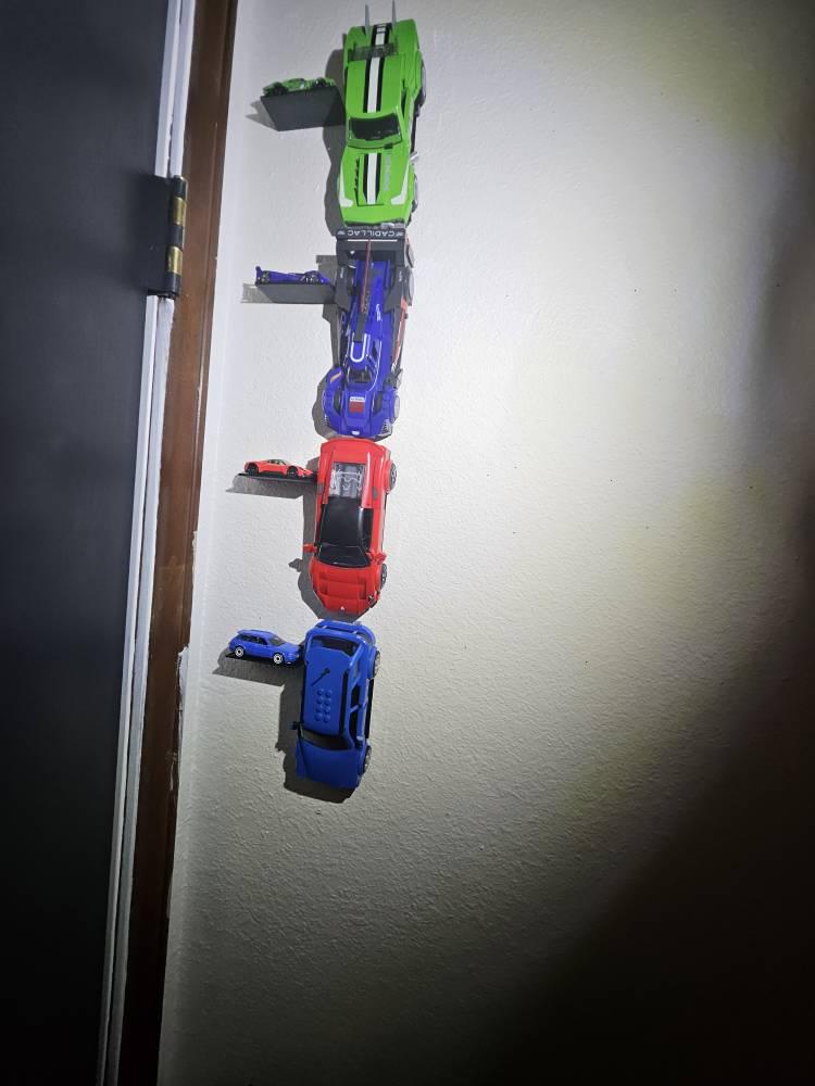 This mount will work with speed series cars from Mattel Brick Shop and securely holds the wheels to keep your car safely mounted flush to the wall. All mounting hardware is included (1 or 2 nails). Feel free to reach out with any questions!